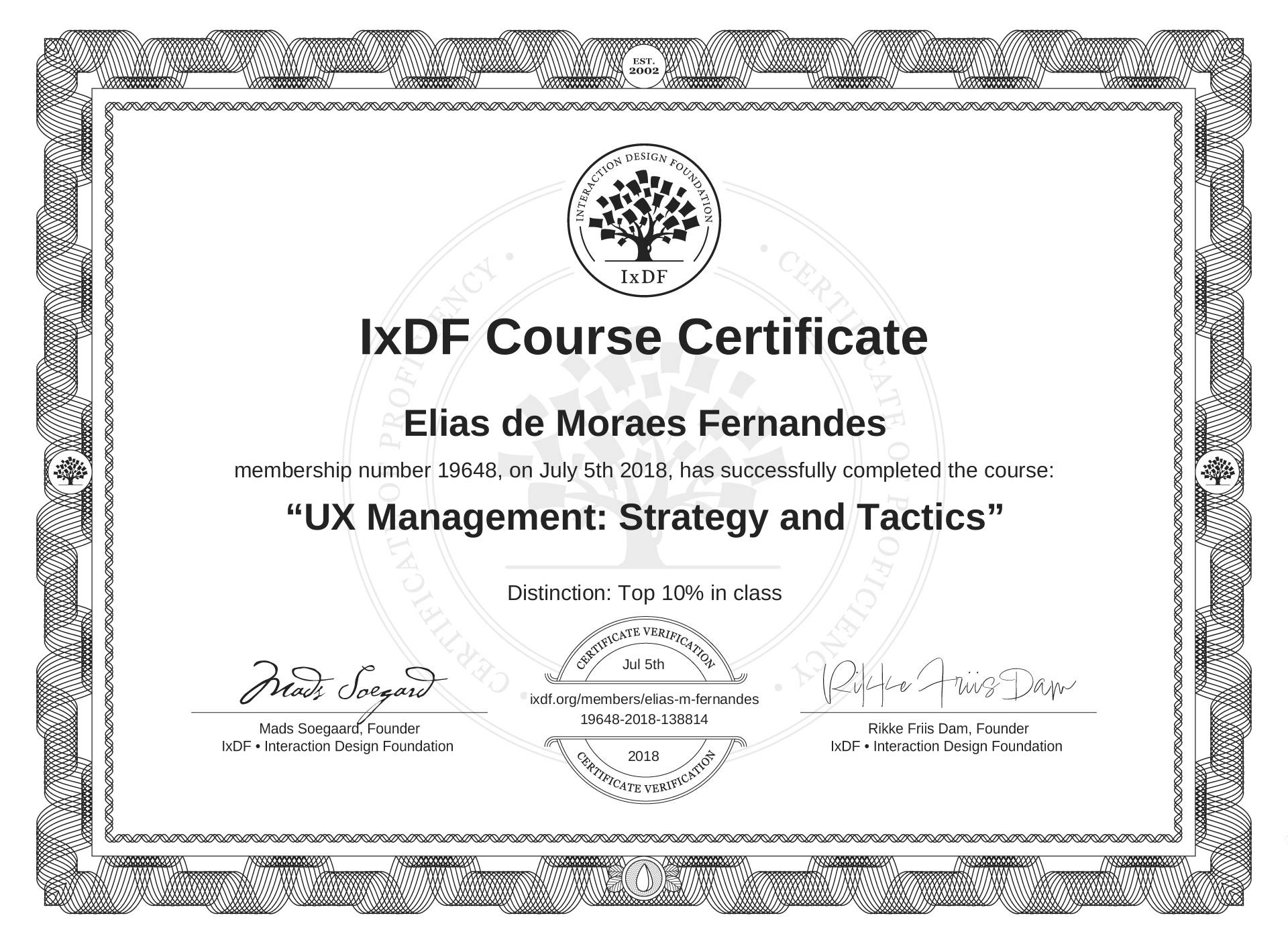 The IxDF Course Certificate above is awarded to Elias de Moraes Fernandes with a Top 10% Distinction in formal recognition of their coursework surpassing the rigorous benchmarks of exceptional performance established by the IxDF Educational Codex.
