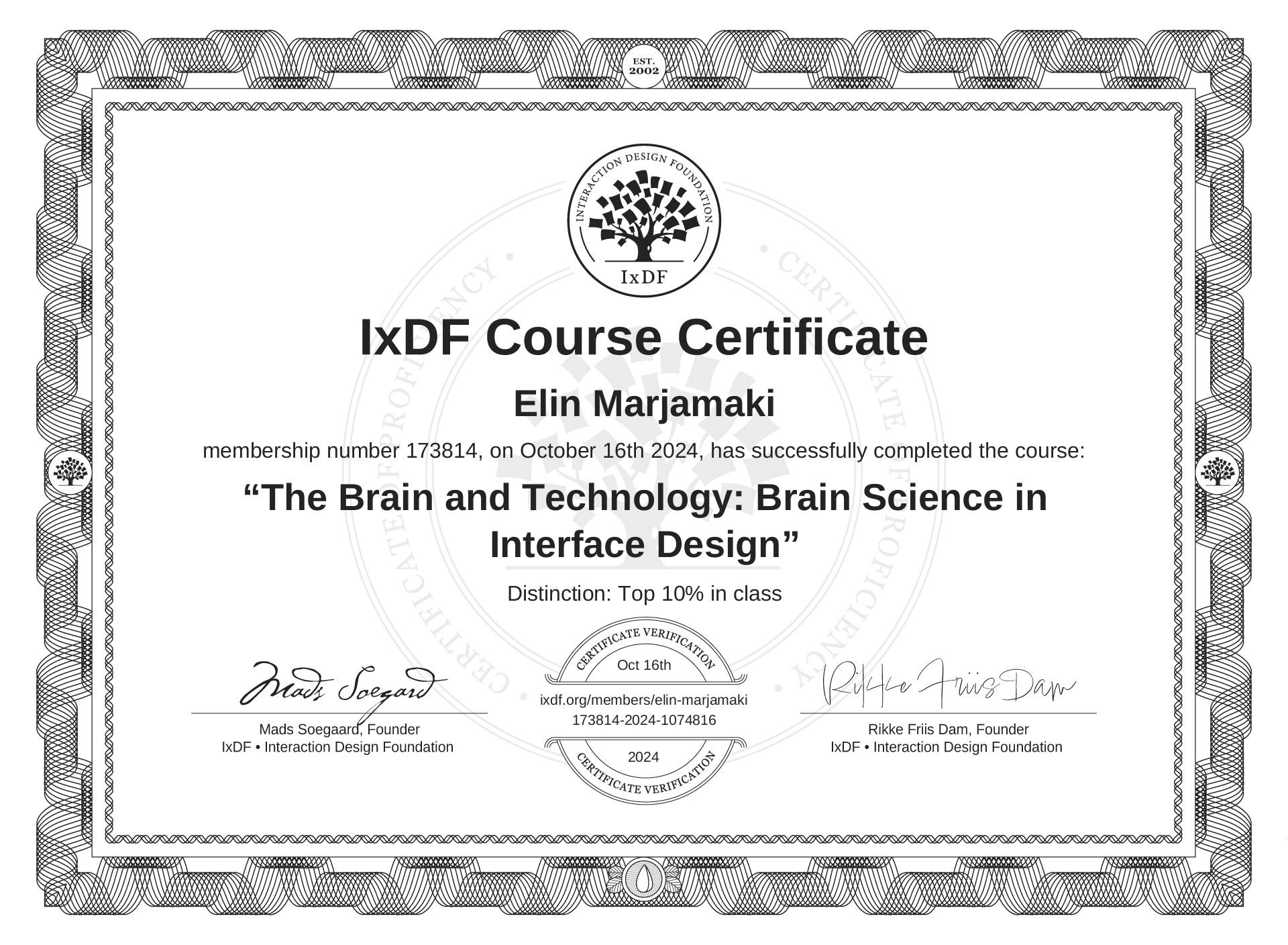 The IxDF Course Certificate above is awarded to Elin Marjamäki with a Top 10% Distinction in formal recognition of their coursework surpassing the rigorous benchmarks of exceptional performance established by the IxDF Educational Codex.
