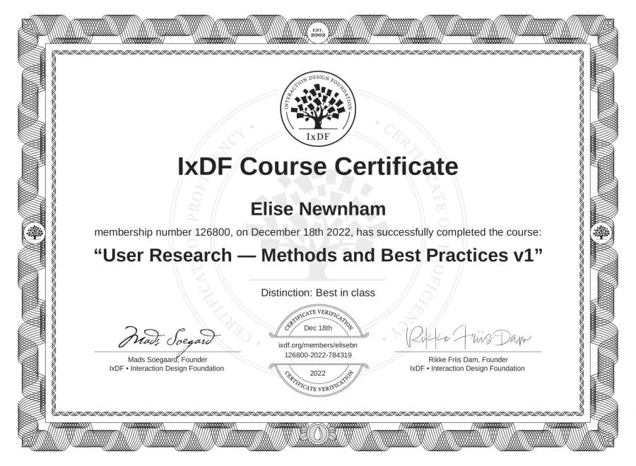 Elise Newnham's IxDF Course Certificate: User Research — Methods and Best Practices v1