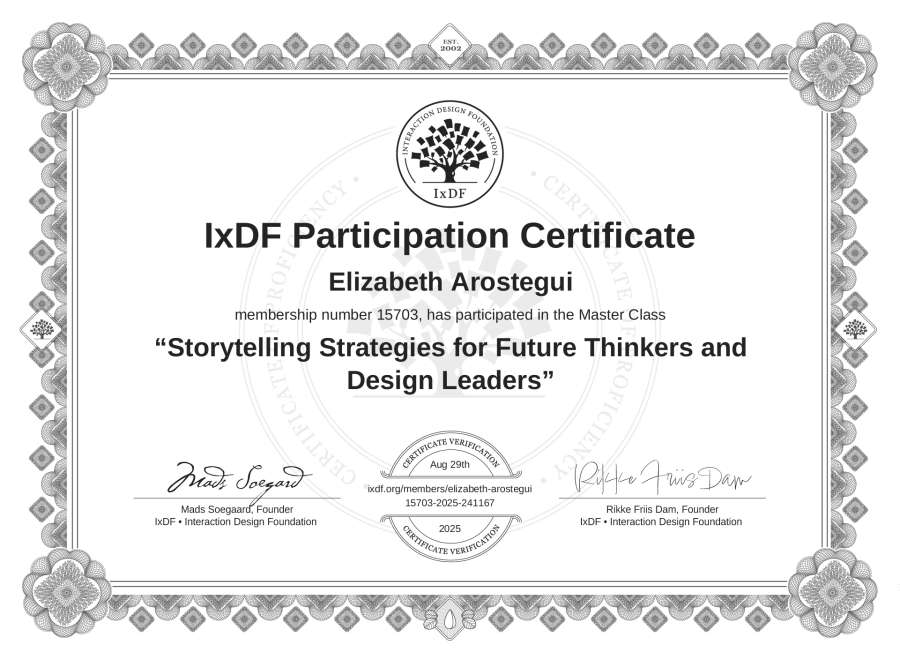Elizabeth Arostegui's IxDF Masterclass Certificate: Storytelling Strategies for Future Thinkers and Design Leaders