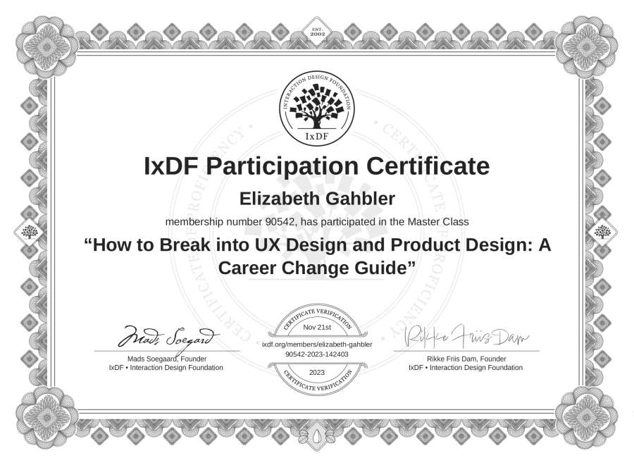 Elizabeth Gahbler's IxDF Masterclass Certificate: How to Break into UX Design and Product Design: A Career Change Guide