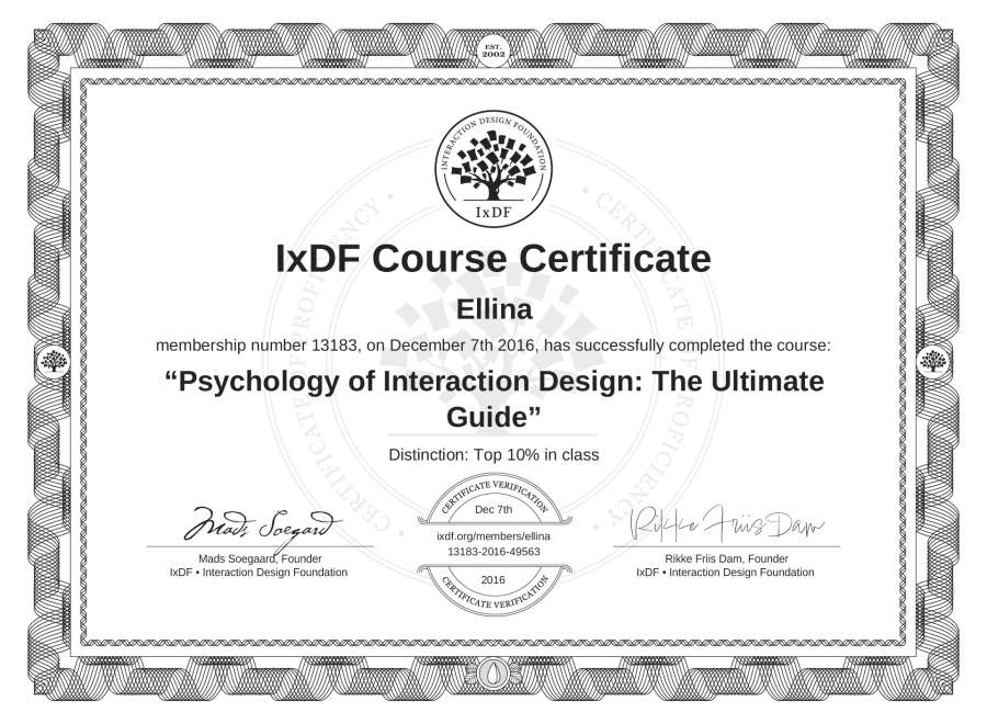 The IxDF Course Certificate above is awarded to Ellina with a Top 10% Distinction in formal recognition of their coursework surpassing the rigorous benchmarks of exceptional performance established by the IxDF Educational Codex.