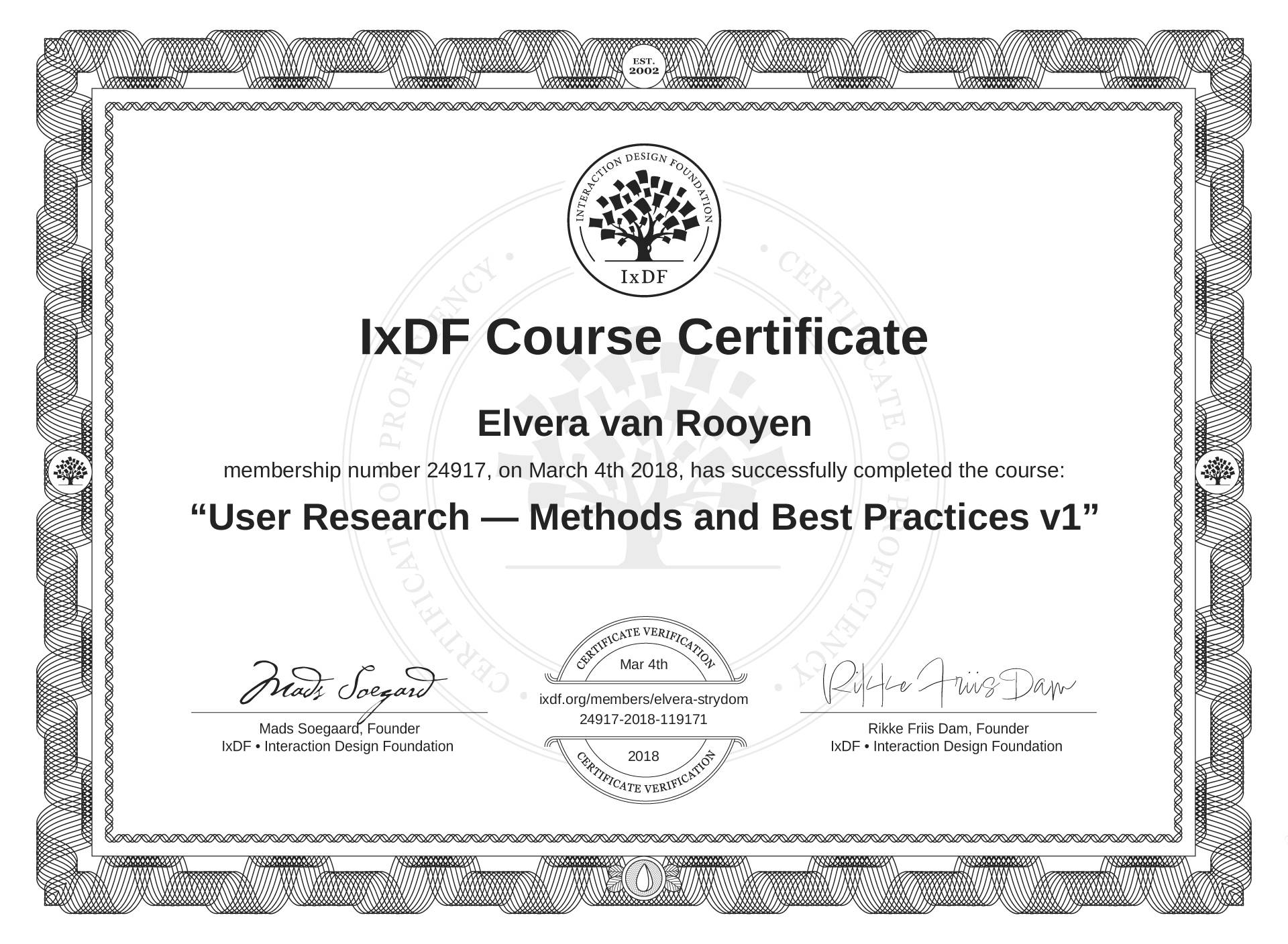 Elvera van Rooyen's IxDF Course Certificate: User Research — Methods and Best Practices v1