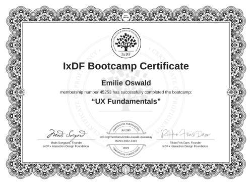 IxDF Course Certificates are awarded to Emilie Oswald in formal recognition of their coursework surpassing the rigorous benchmarks of exceptional performance established by the IxDF Educational Codex.