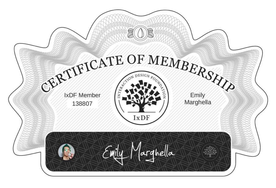 The Membership Certificate below verifies that Emily Marghella is a member of Interaction Design Foundation.