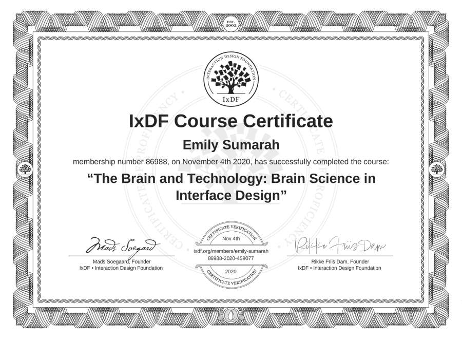 Emily Sumarah's IxDF Course Certificate: The Brain and Technology: Brain Science in Interface Design