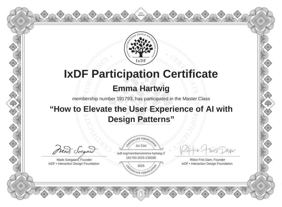 Emma Hartwig's IxDF Masterclass Certificate: How to Elevate the User Experience of AI with Design Patterns