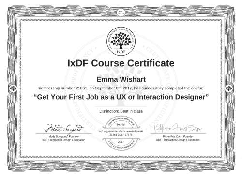 This IxDF Membership Certificate is issued to Emma Wishart in formal recognition of their membership of the IxDF, global leader in design education.