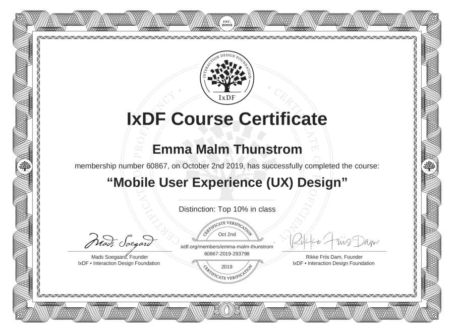 Emma Malm Thunström's IxDF Course Certificate: Mobile User Experience (UX) Design