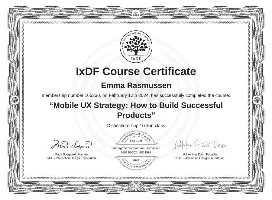 Emma Rasmussen's IxDF Course Certificate: Mobile UX Strategy: How to Build Successful Products