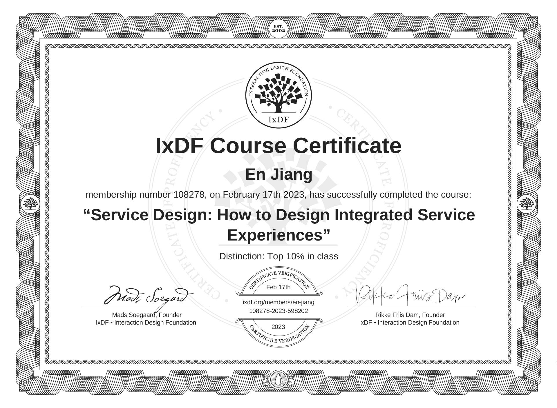 The IxDF Course Certificate above is awarded to En Jiang with a Top 10% Distinction in formal recognition of their coursework surpassing the rigorous benchmarks of exceptional performance established by the IxDF Educational Codex.