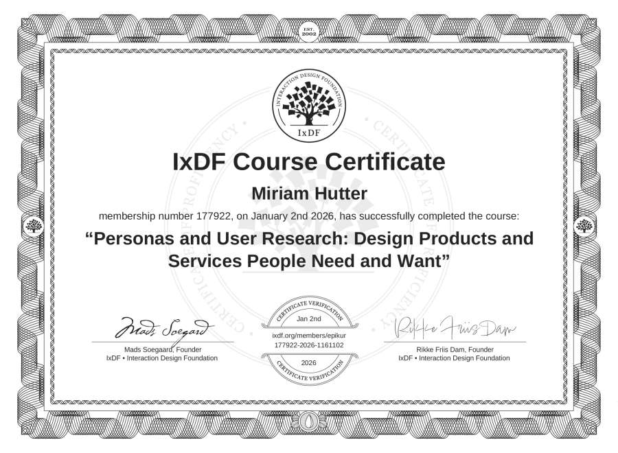 Miriam Hutter's IxDF Course Certificate: Personas and User Research: Design Products and Services People Need and Want