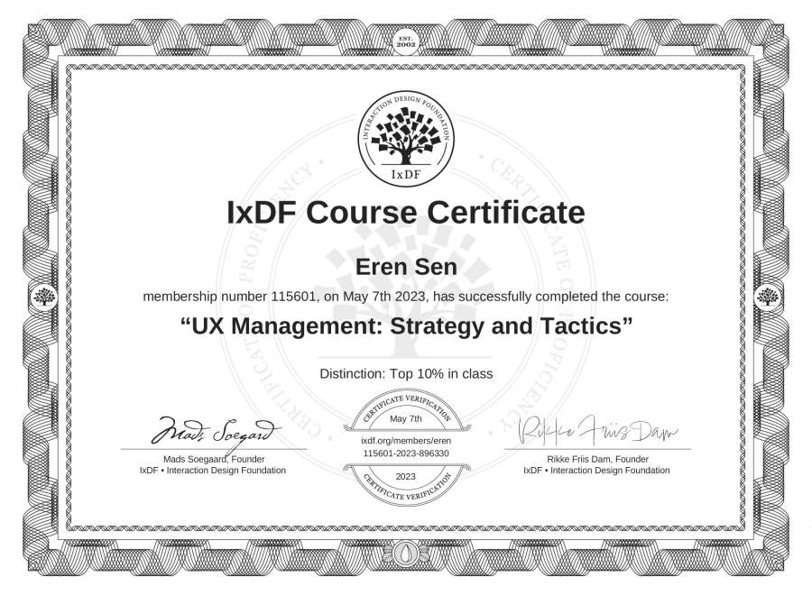 Eren Şen's IxDF Course Certificate: UX Management: Strategy and Tactics
