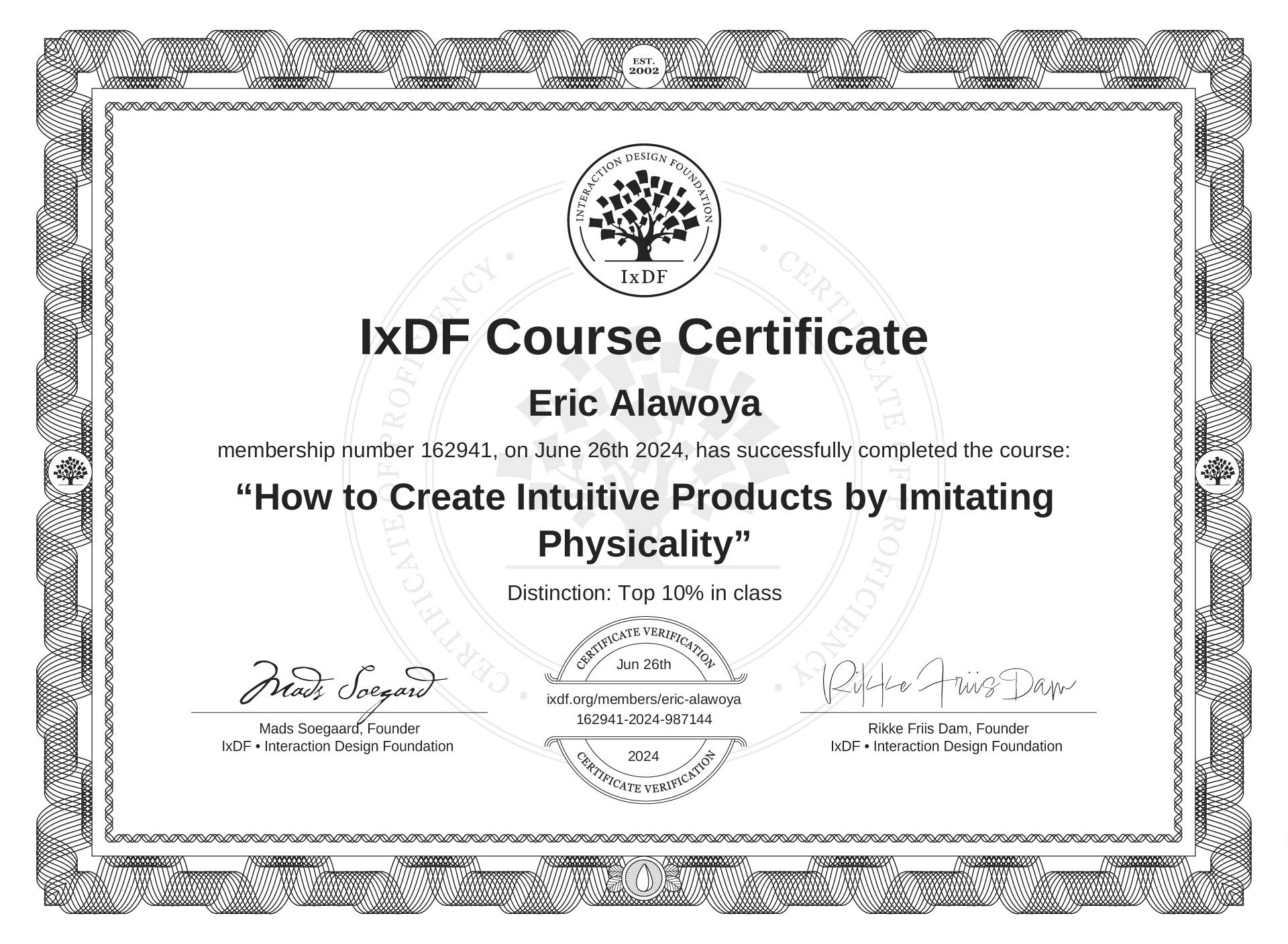 Eric Alawoya's IxDF Course Certificate: How to Create Intuitive Products by Imitating Physicality