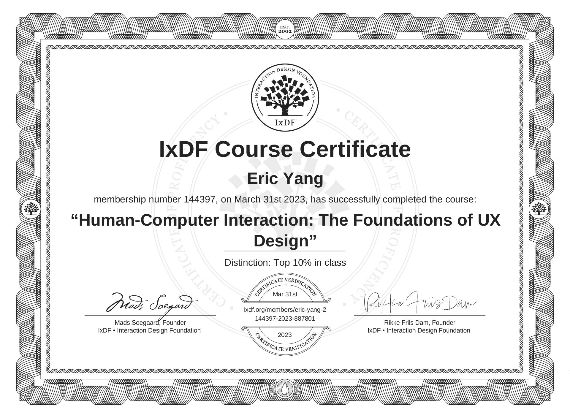 The IxDF Course Certificate above is awarded to Eric Yang with a Top 10% Distinction in formal recognition of their coursework surpassing the rigorous benchmarks of exceptional performance established by the IxDF Educational Codex.