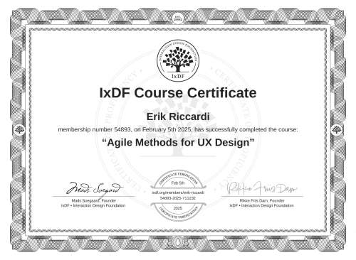 IxDF Course Certificates are awarded to Erik Riccardi in formal recognition of their coursework surpassing the rigorous benchmarks of exceptional performance established by the IxDF Educational Codex.