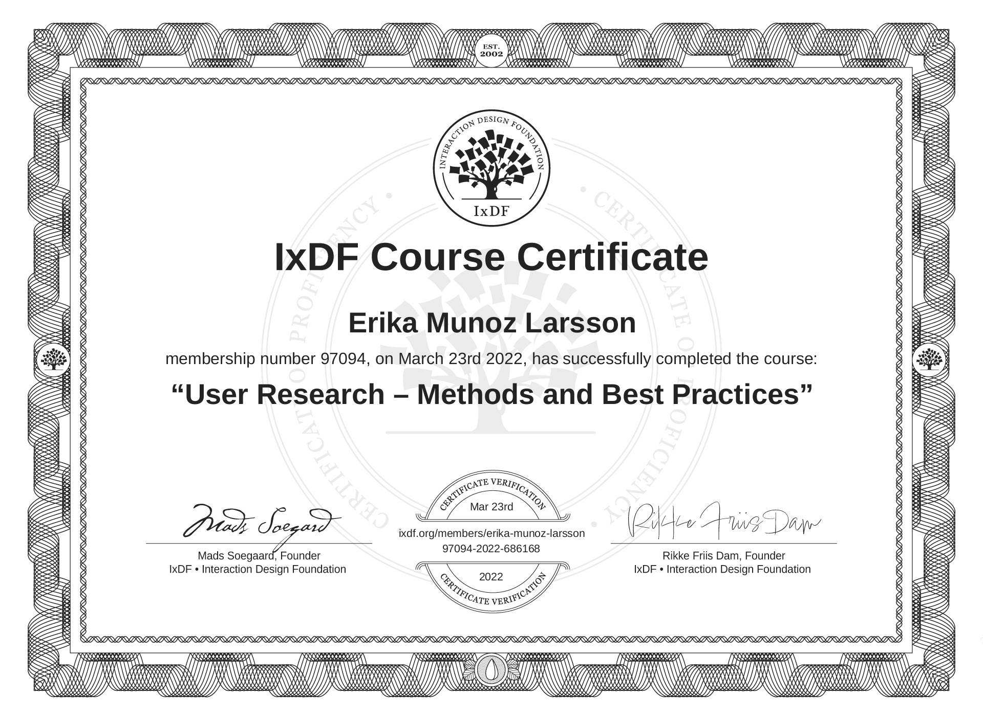 Erika Muñoz Larsson's IxDF Course Certificate: User Research – Methods and Best Practices