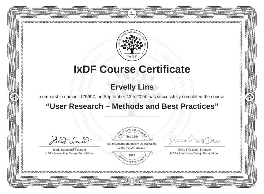 Ervelly Lins's IxDF Course Certificate: User Research – Methods and Best Practices