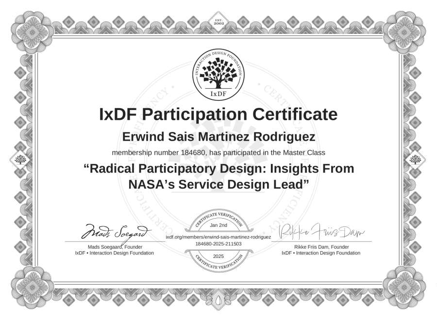 Erwind Sais Martinez Rodriguez's IxDF Masterclass Certificate: Radical Participatory Design: Insights From NASA’s Service Design Lead