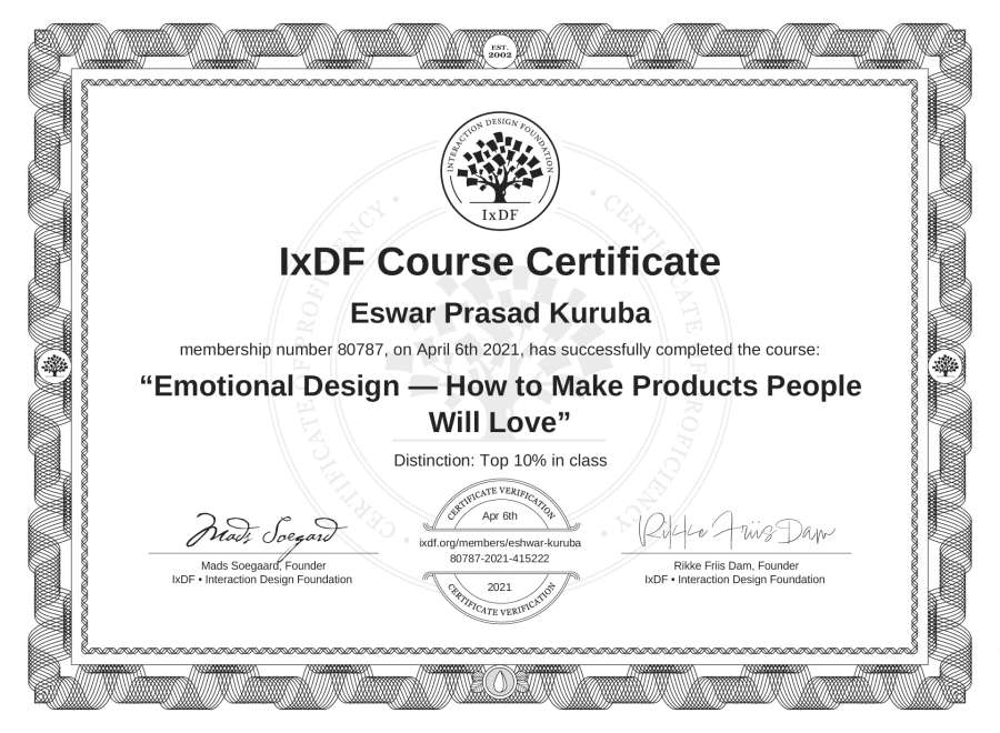 Eswar Prasad Kuruba's IxDF Course Certificate: Emotional Design — How to Make Products People Will Love