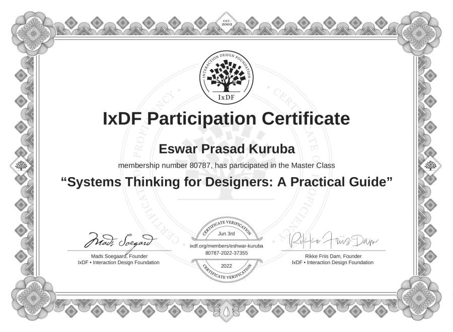 Eswar Prasad Kuruba's IxDF Masterclass Certificate: Systems Thinking for Designers: A Practical Guide