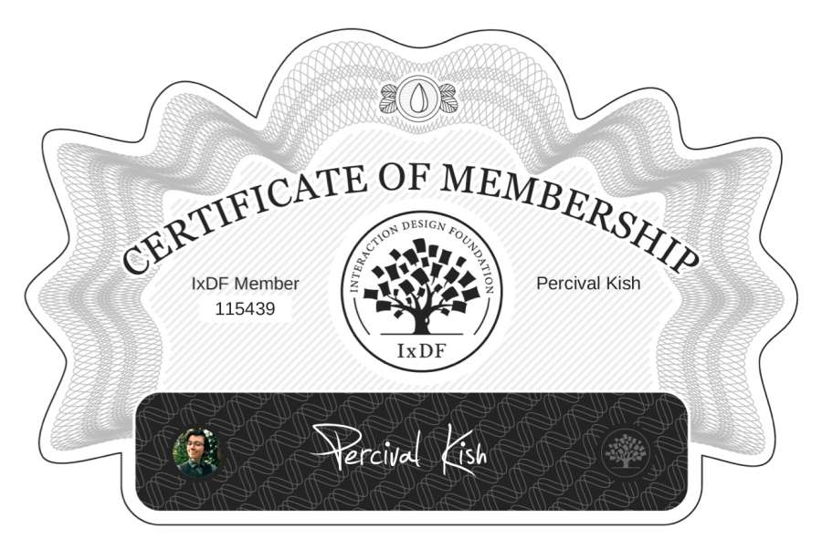 The Membership Certificate below verifies that Percival Kish is a member of Interaction Design Foundation.