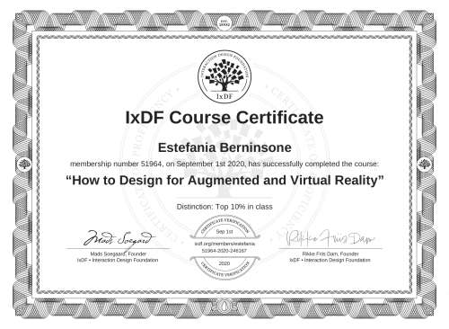 This IxDF Membership Certificate is issued to Estefanía Berninsone in formal recognition of their membership of the IxDF, global leader in design education.
