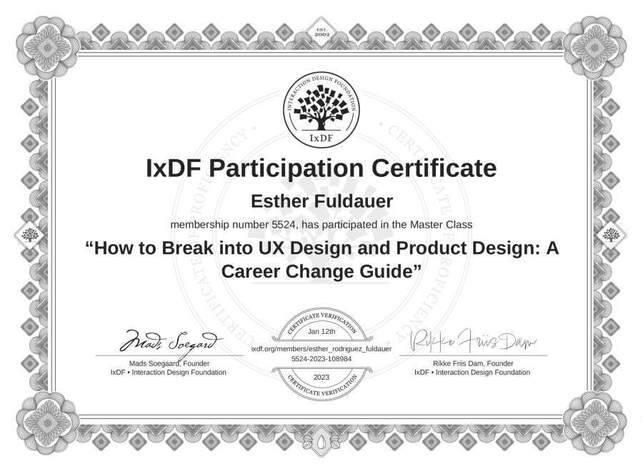 Esther Fuldauer's IxDF Masterclass Certificate: How to Break into UX Design and Product Design: A Career Change Guide