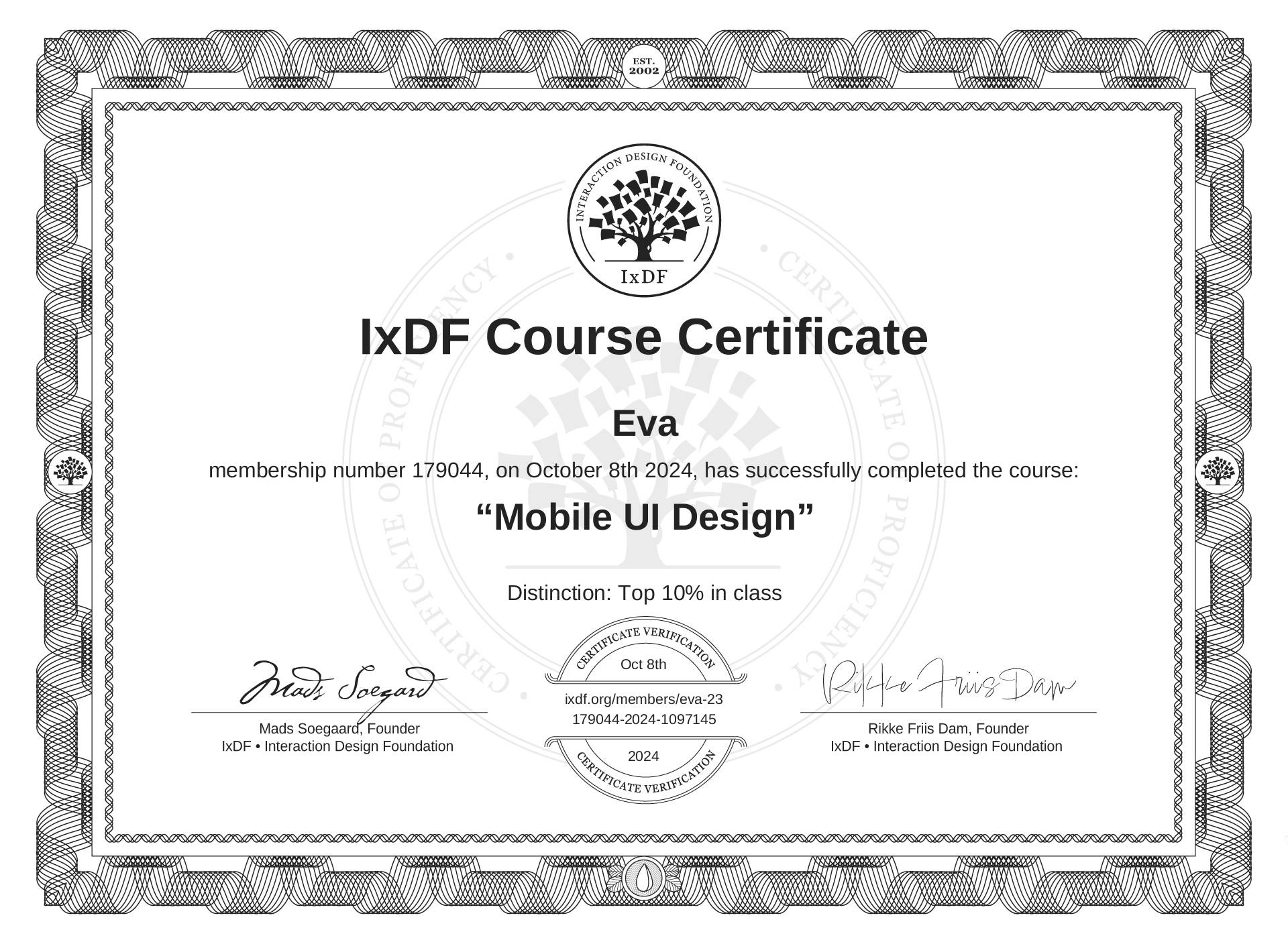 The IxDF Course Certificate above is awarded to Eva with a Top 10% Distinction in formal recognition of their coursework surpassing the rigorous benchmarks of exceptional performance established by the IxDF Educational Codex.