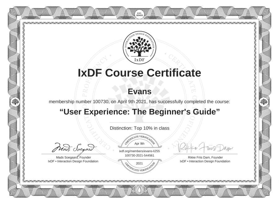 The IxDF Course Certificate above is awarded to Evans with a Top 10% Distinction in formal recognition of their coursework surpassing the rigorous benchmarks of exceptional performance established by the IxDF Educational Codex.