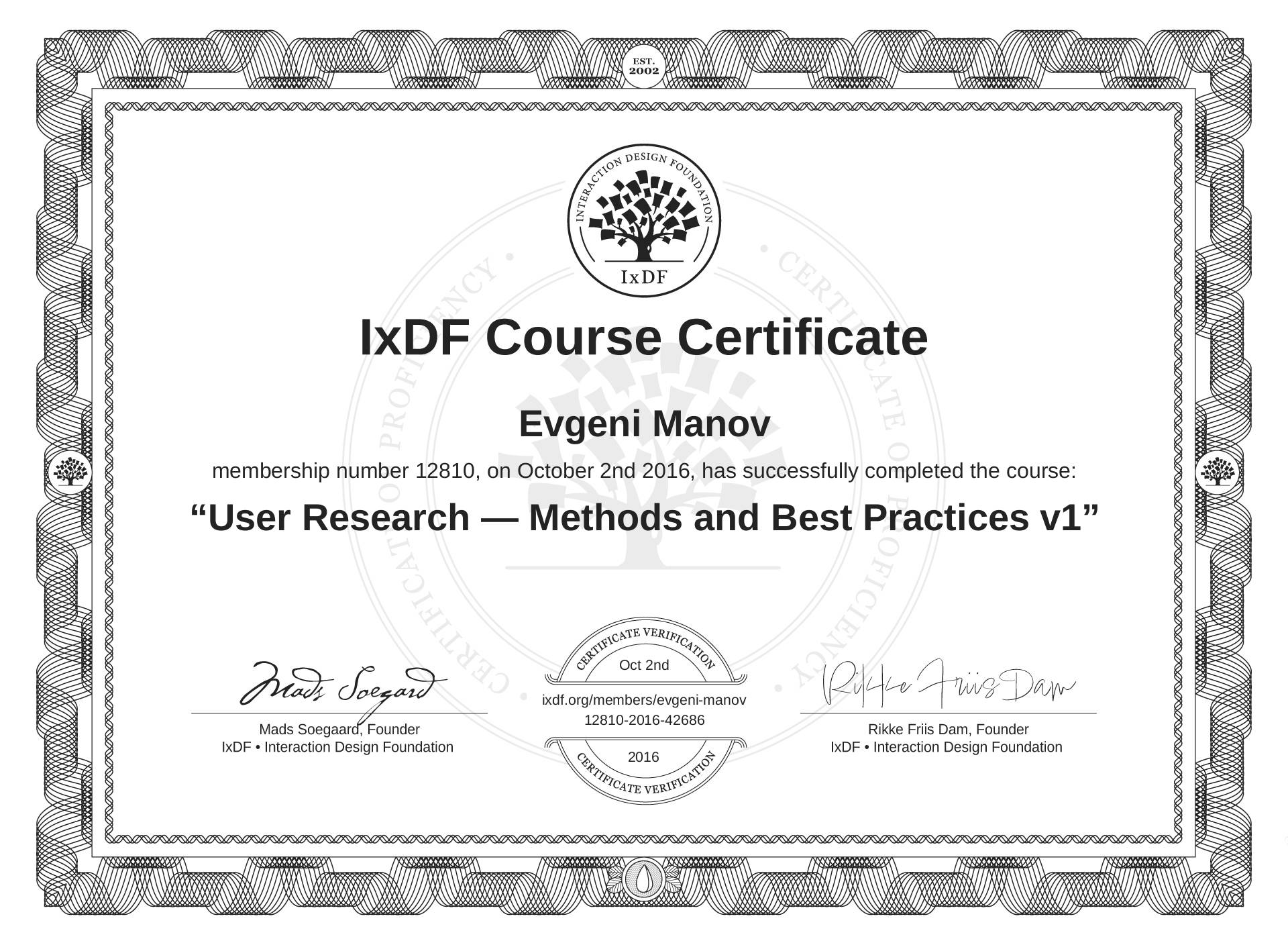 Evgeni Manov's IxDF Course Certificate: User Research — Methods and Best Practices v1