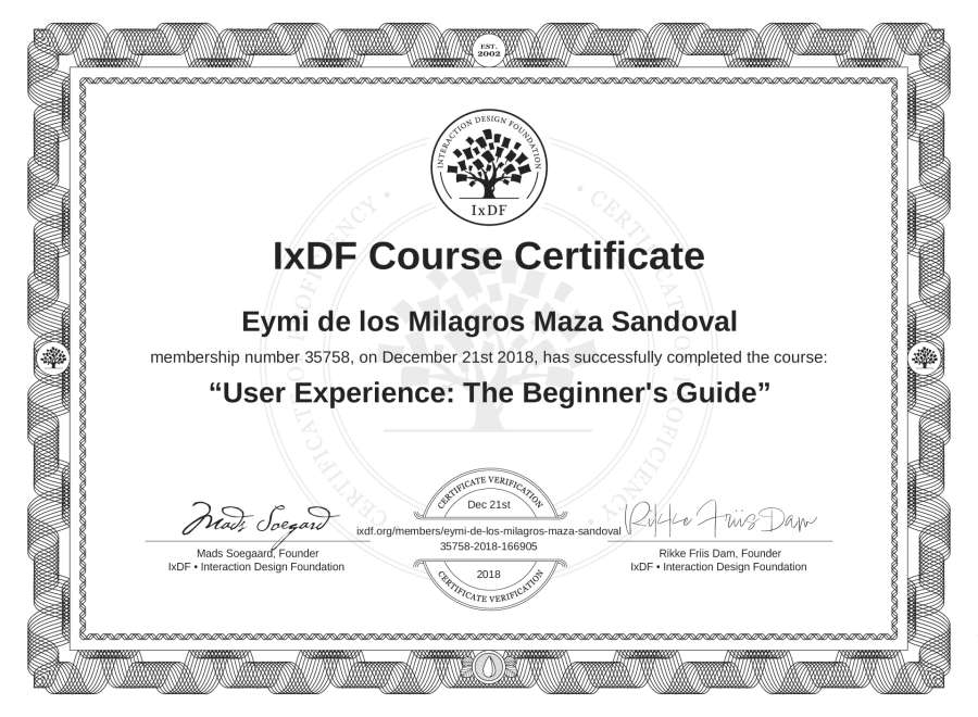 Eymi de los Milagros Maza Sandoval's IxDF Course Certificate: User Experience: The Beginner's Guide