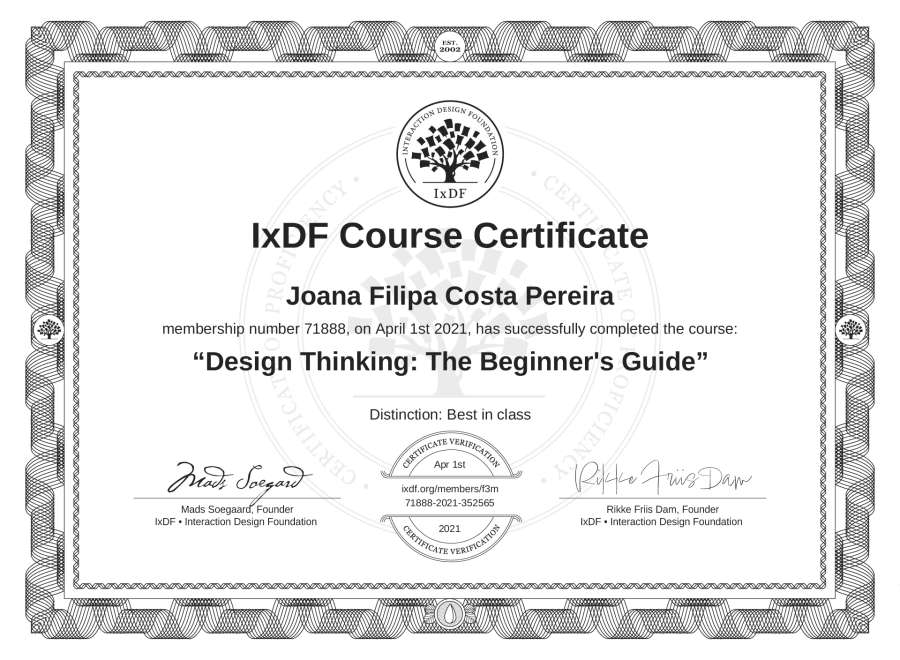 The IxDF Course Certificate above is awarded to Joana Filipa Costa Pereira with a Best in Class Distinction in formal recognition of their coursework surpassing the rigorous benchmarks of exceptional performance established by the IxDF Educational Codex.
