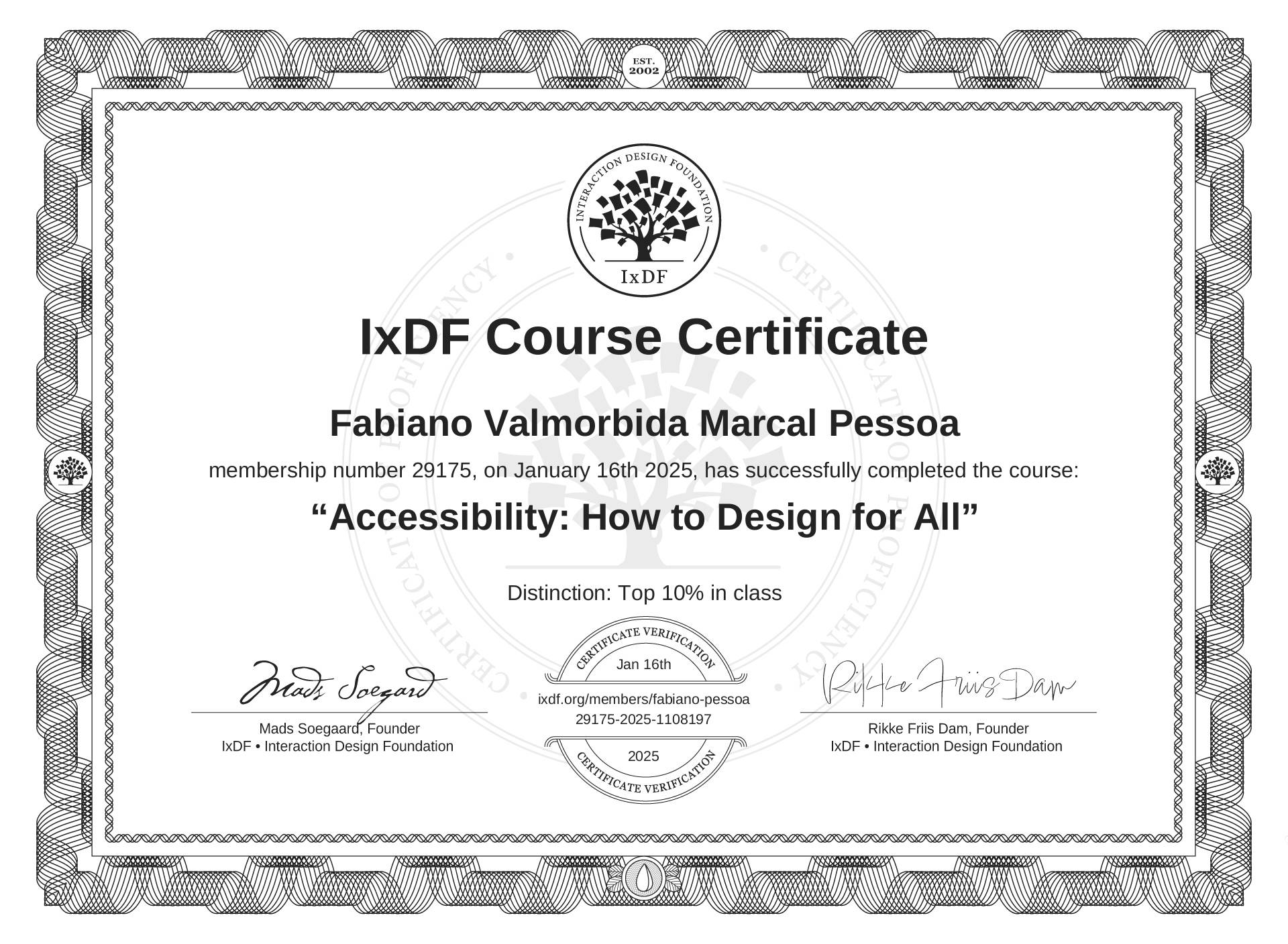 The IxDF Course Certificate above is awarded to Fabiano Valmorbida Marçal Pessôa with a Top 10% Distinction in formal recognition of their coursework surpassing the rigorous benchmarks of exceptional performance established by the IxDF Educational Codex.