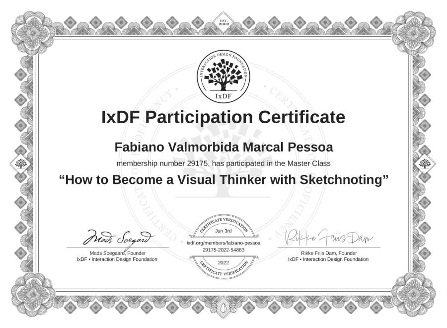 Fabiano Valmorbida Marçal Pessôa's IxDF Masterclass Certificate: How to Become a Visual Thinker with Sketchnoting
