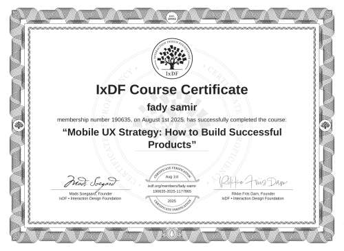 IxDF Course Certificates are awarded to fady samir in formal recognition of their coursework surpassing the rigorous benchmarks of exceptional performance established by the IxDF Educational Codex.