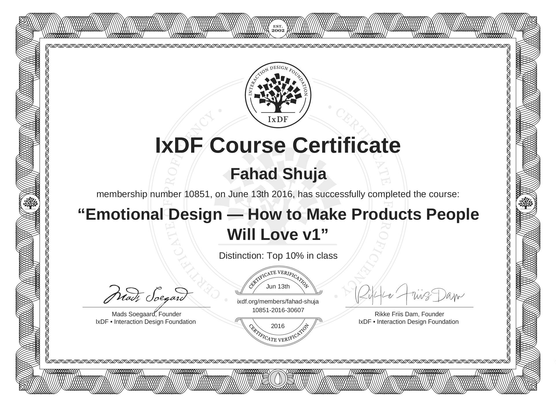 Fahad Shuja's IxDF Course Certificate: Emotional Design — How to Make Products People Will Love v1