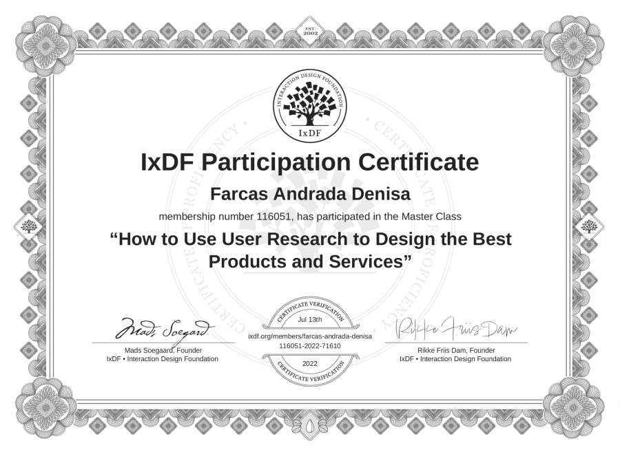 Farcas Andrada Denisa's IxDF Masterclass Certificate: How to Use User Research to Design the Best Products and Services