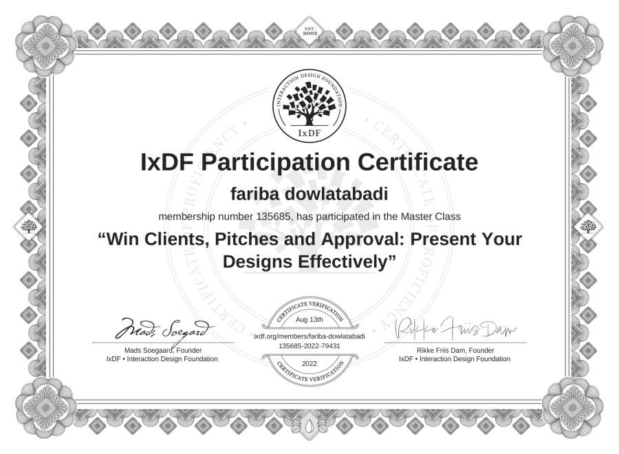 fariba dowlatabadi's IxDF Masterclass Certificate: Win Clients, Pitches and Approval: Present Your Designs Effectively