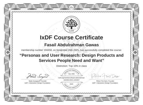 IxDF Course Certificates are awarded to Fasail Abdulrahman Gawas in formal recognition of their coursework surpassing the rigorous benchmarks of exceptional performance established by the IxDF Educational Codex.
