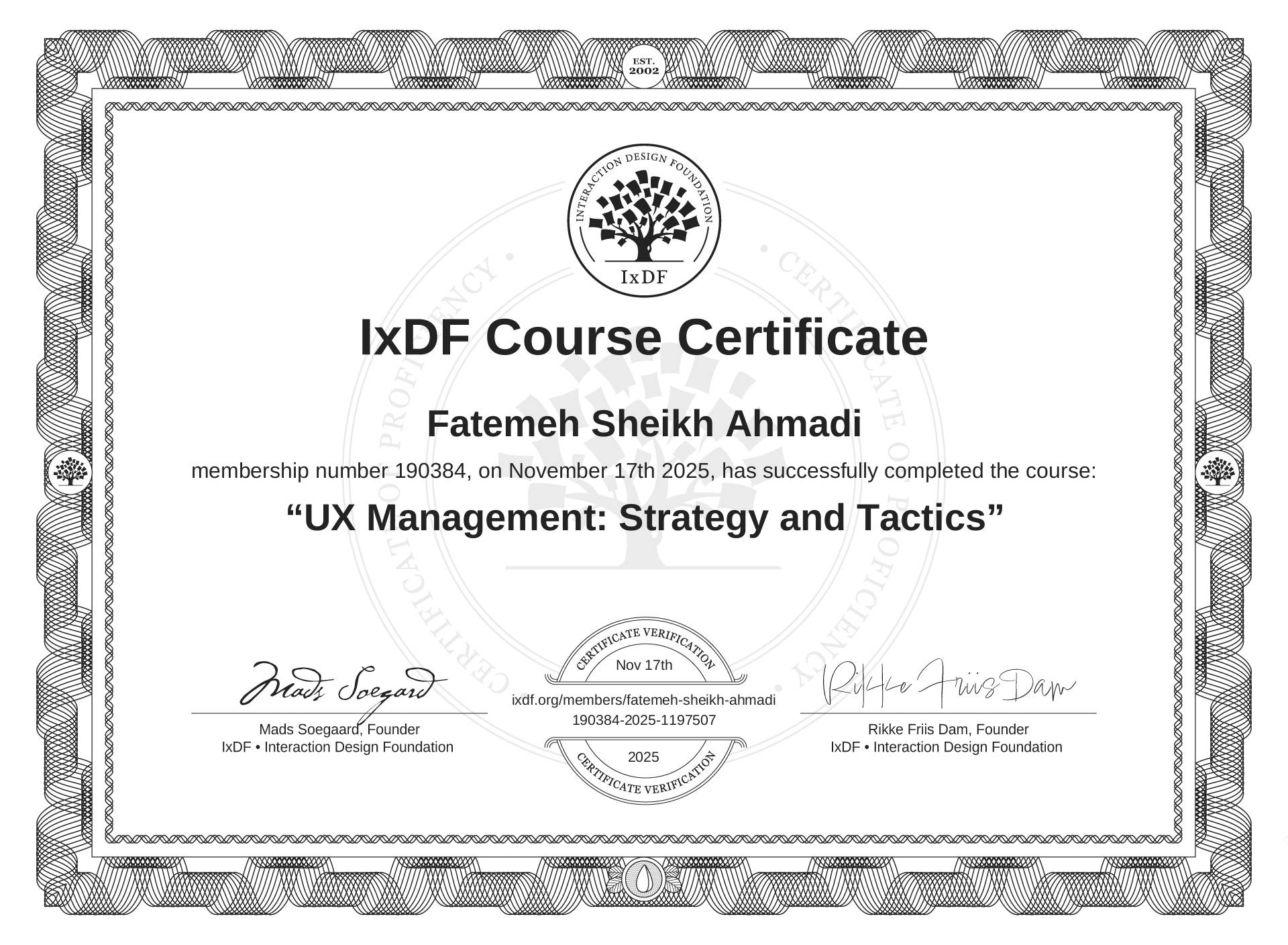 The IxDF Course Certificate above is awarded to Fatemeh Sheikh Ahmadi in formal recognition of their coursework surpassing the rigorous benchmarks of exceptional performance established by the IxDF Educational Codex.