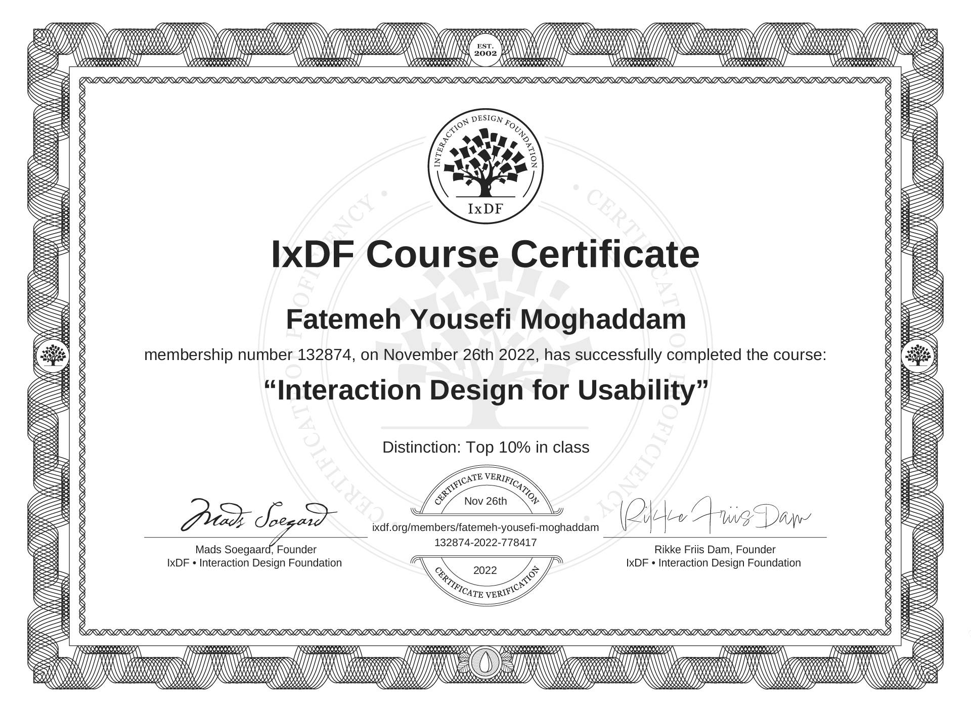 The IxDF Course Certificate above is awarded to Fatemeh Yousefi Moghaddam with a Top 10% Distinction in formal recognition of their coursework surpassing the rigorous benchmarks of exceptional performance established by the IxDF Educational Codex.