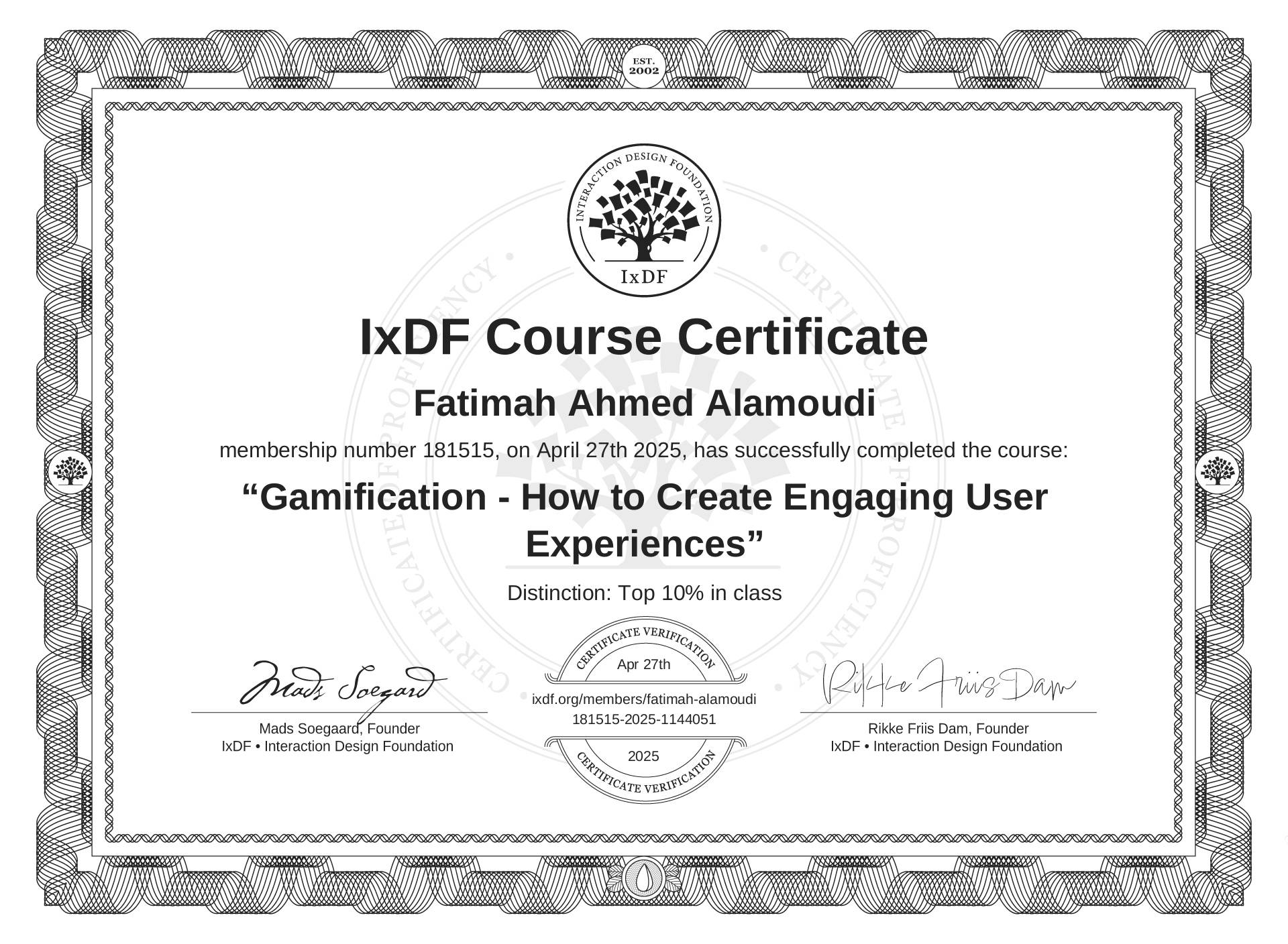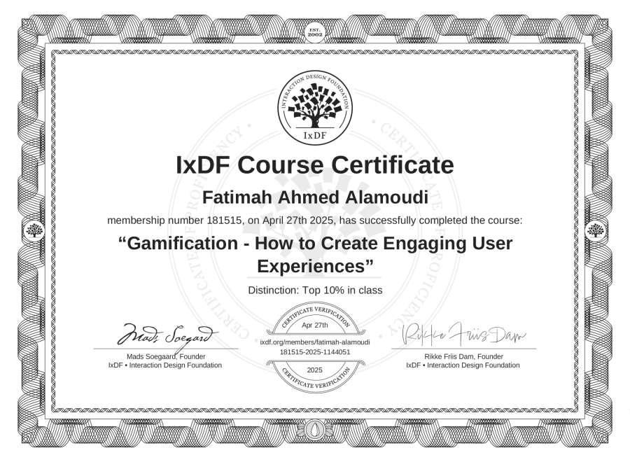 Fatimah Ahmed Alamoudi's IxDF Course Certificate: Gamification - How to Create Engaging User Experiences