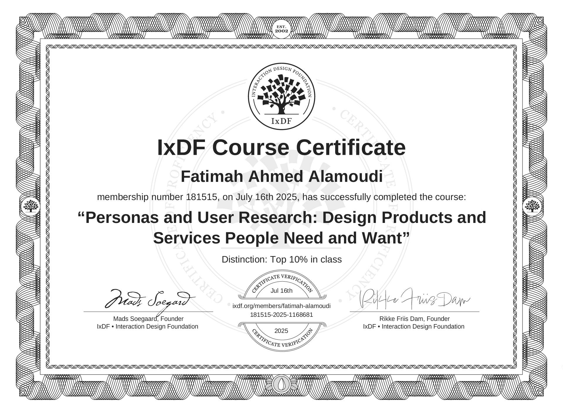 The IxDF Course Certificate above is awarded to Fatimah Ahmed Alamoudi with a Top 10% Distinction in formal recognition of their coursework surpassing the rigorous benchmarks of exceptional performance established by the IxDF Educational Codex.