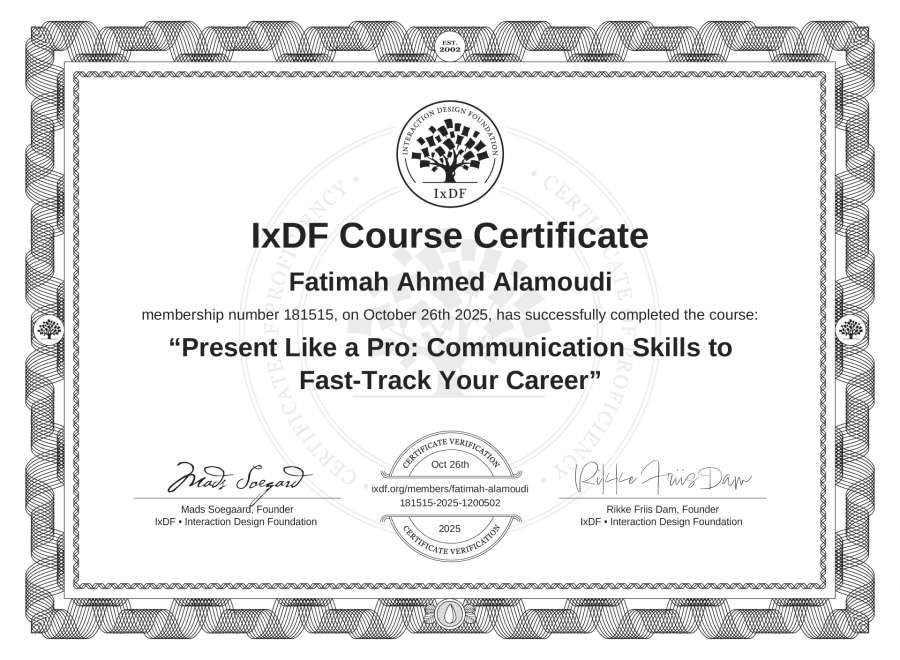 Fatimah Ahmed Alamoudi's IxDF Course Certificate: Present Like a Pro: Communication Skills to Fast-Track Your Career