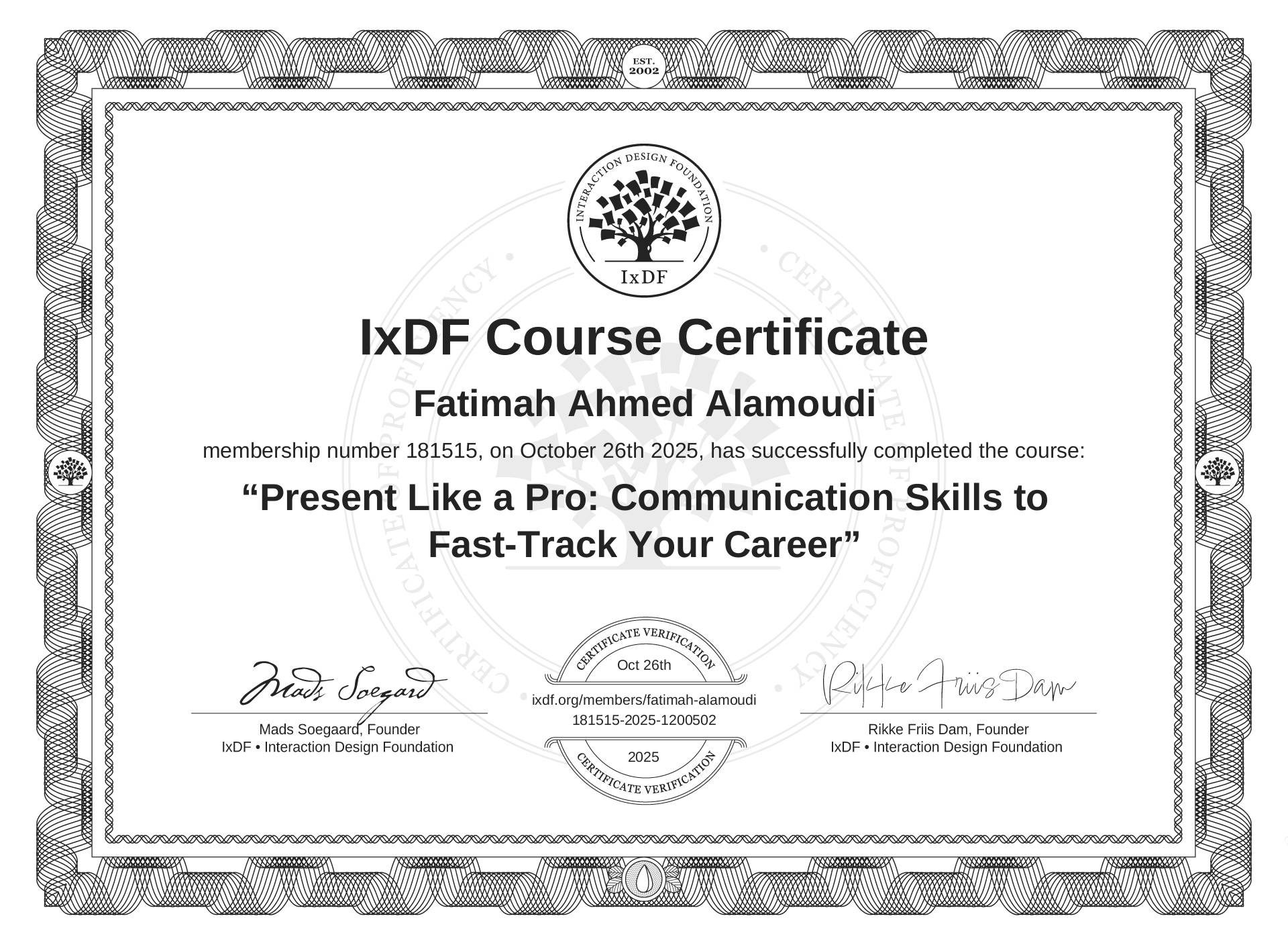 Fatimah Ahmed Alamoudi's IxDF Course Certificate: Present Like a Pro: Communication Skills to Fast-Track Your Career
