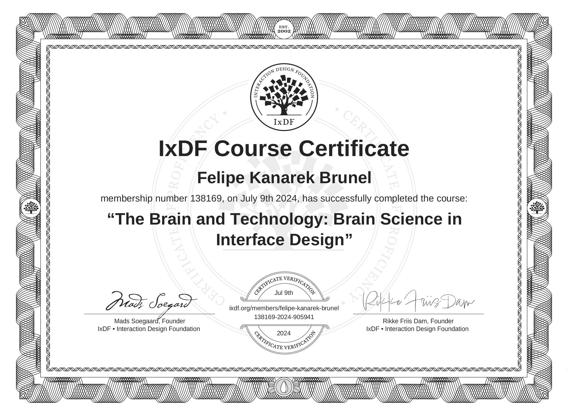 Felipe Kanarek Brunel's IxDF Course Certificate: The Brain and Technology: Brain Science in Interface Design