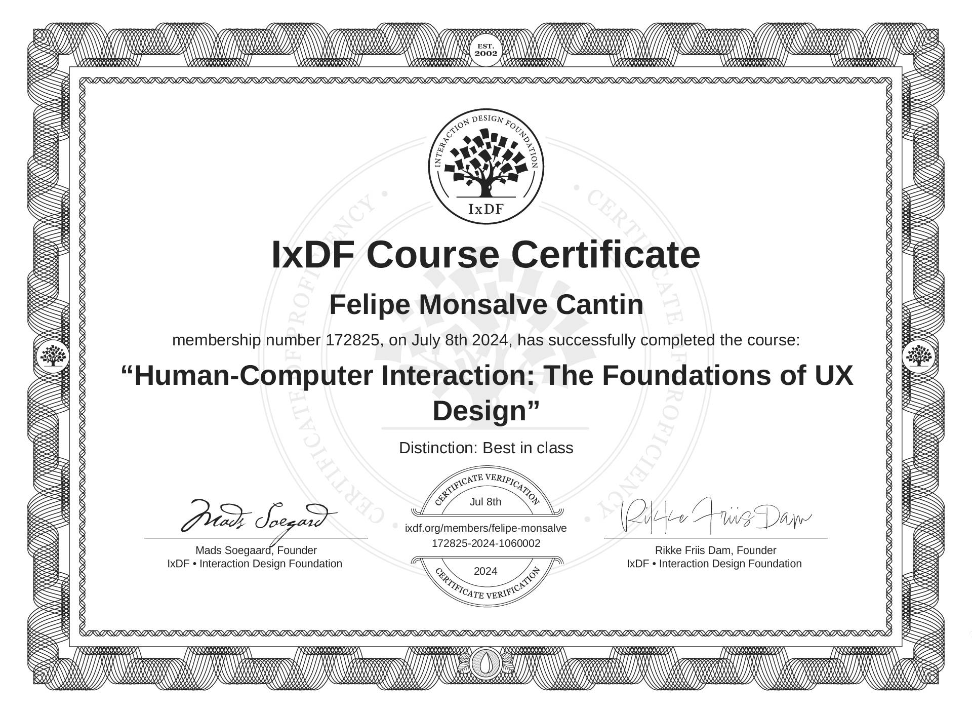 The IxDF Course Certificate above is awarded to Felipe Monsalve Cantin with a Best in Class Distinction in formal recognition of their coursework surpassing the rigorous benchmarks of exceptional performance established by the IxDF Educational Codex.