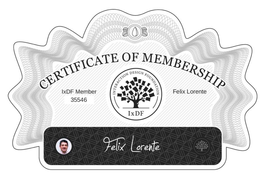 The Membership Certificate below verifies that Félix Lorente is a member of Interaction Design Foundation.