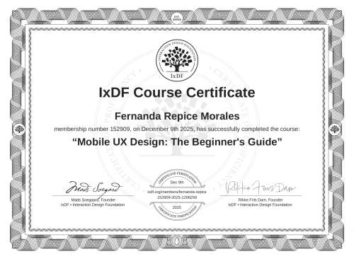 IxDF Course Certificates are awarded to Fernanda Repice Morales in formal recognition of their coursework surpassing the rigorous benchmarks of exceptional performance established by the IxDF Educational Codex.